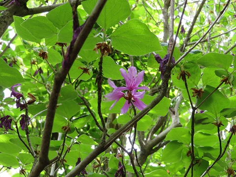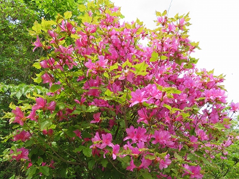 | しかし残念ながら、アワノミツバツツジの花は終わり、地面に紫色の花絨毯ができています。一方、ツツジトンネルの中でオンツツジの濃い赤色の花が満開。