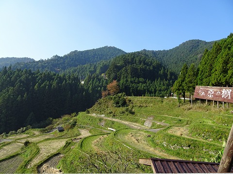 | 更に県道を進み、樫原の棚田・山犬嶽の案内板のある分岐を舗装林道に。狭い林道を登り、樫原の棚田・山犬嶽の駐車場に。ここから登山口まで勾配のある舗装林道を約30歩き。 |