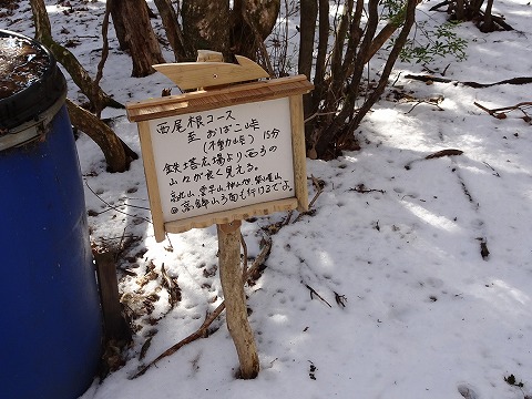 | 登山道も例年に比べて積雪は大幅に少ない。展望台、旭ヶ丸の周辺のドウダン、ミツバツツジの林も枝が折れ曲がるほどになるのだが、今回は木には雪が全くかかっていない。その下の登山道も吹きだまり効果で例年だと膝下くらいまで埋まるのだが、なんと地面がむき出しになっている場所も。 |