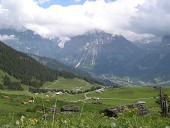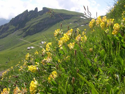 | 下り始めると天気も次第に回復してきました。登ったときは霧の中であったファウルホルンも遠望でき、花畑も楽しめました。ブスアルプに近づくとあちらこちらで牛が放牧されています。大きく、肌の艶やかな立派な牛です。神の使いとして敬意を払われているネパールの牛よりも清潔で立派な印象です。栄養が良いのかな。 |