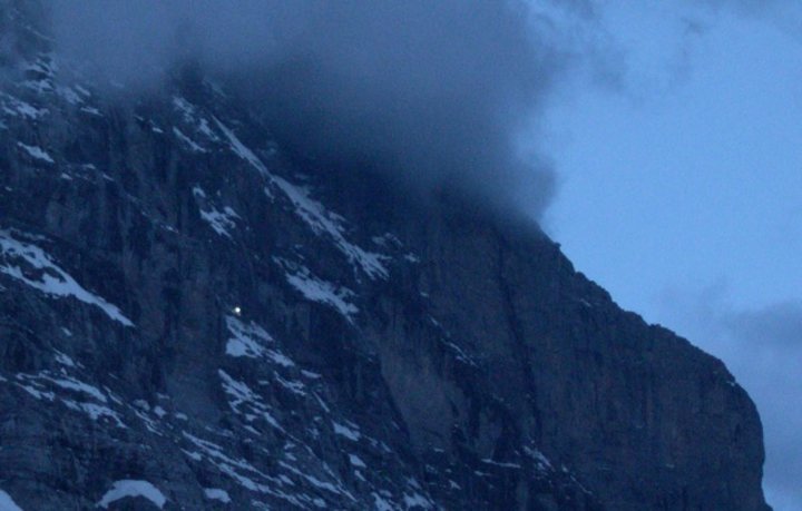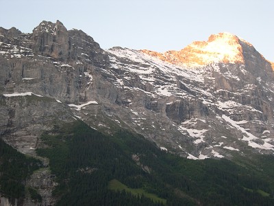 ブスアルプから戻ったグリンデルワルトの町、ホテルのテラスから見たアイガーバンドの窓の灯りそして翌朝の朝焼けの写真です。
