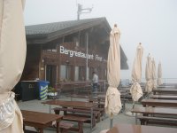 ロープウェーでフィルスト展望台(2168m)へ。これまで快晴に恵まれましたが、今日は曇天、ひょっとしたら雨も降ってきそうな空模様です。外のベンチ、木製のリクライニングの長椅子などにも人っ子ひとりいません。 |
