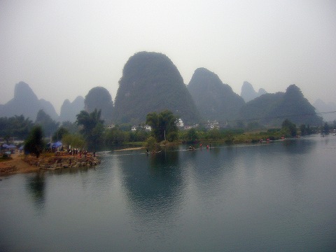 | 時間がないのか、橋のところで慌ただしく景色を眺めて桂林へ戻りました。 陽朔、高田郷は桂林以上に山水画の風景と田園風景が素晴らしいそうですが、格安ツアのためか省略。