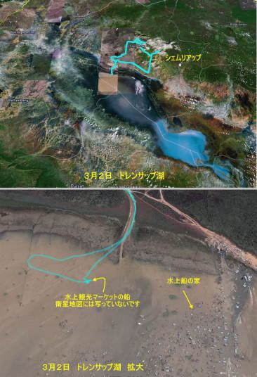 トンレサップ湖、琵琶湖の10倍もあります。もちろん、ワニから大きな蛇もいるようです。湖畔の道路には高床式のバラックの家、売店。湖面には筏あるいは船に乗った住宅、学校、病院が多数(グーグルアースでも点在するこれらの家々が見えます)。