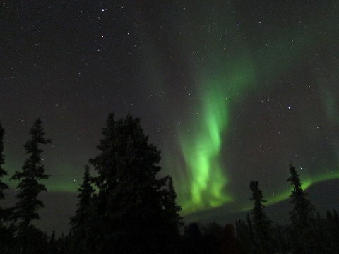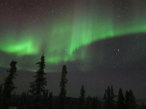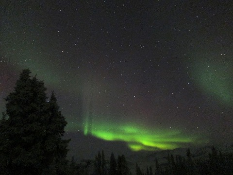 | アクティビティセンターの裏。遅い夕食後に突如として現れたオーロラ大盤振る舞い。ツア仲間と大騒ぎで眺め、かつ写真撮影。 |