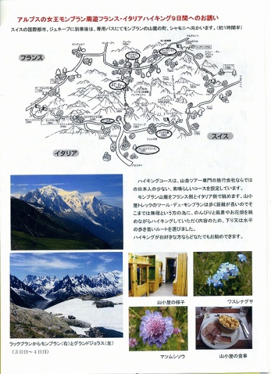 山ツアの会社から送られてきたパンフレット。時間的にもおそらく体力的にもちょっと無理かなと思われるツールドモンブランの一部を体験できそう。いつかは行きたいと思っていたシャモニーを拠点にした軽ハイキングで、山小屋も利用する願ったり叶ったりの企画です。早速申し込みしたが、催行人数になるか不安で何度かコンタクト。ツア会社も支社による初めての企画、できるだけ催行したいとの事。パンフレット別刷りを一部の顧客へ送付するだけでなくホームページでの紹介掲載もアドバイス。 |