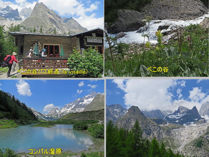 トレッキング五日目。昨晩の宿、エレナ小屋から山道側を通ってアルヌーバへ戻ります。アルヌーバ-から路線バスでクールマイユールに戻って、バスを乗り換えてベニの谷、コンパル湿原をトレッキング。その後、この日はシャモニーまで。
