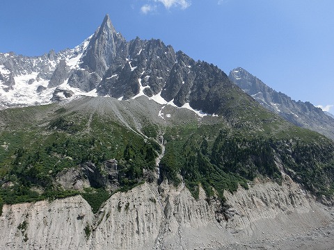 標高 約3800mのエギュ・デュ・ミディからの大展望を楽しんだ後はロープウェー中間駅のプラン・ドゥ・レギュイーュからメールドグラス氷河(モンタンベール)までトレッキング。 氷河からは登山列車で シャモニーに戻り、路線バスにてモンブラン・トンネルを通ってイタリヤへ移動です