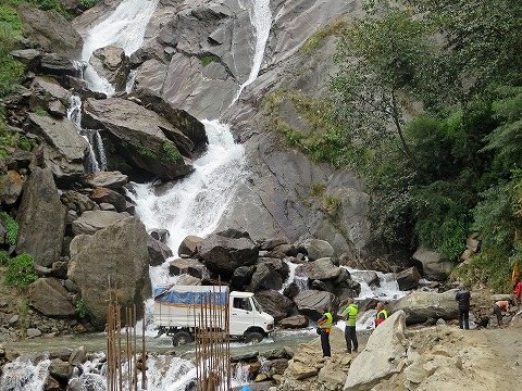 行きは薄暗くて素通りしたルクセチャラの三段の滝。帰りは下車して観光です。滝の下の流れのなかをバイクも車も渡渉し、なかなかの迫力。