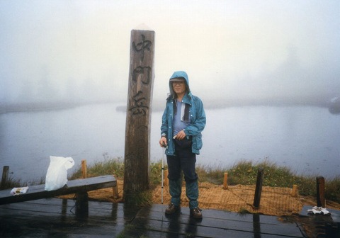 歩きはじめて4時間、やっと開けた場所に出ました。ガスの中にうっすらと浮かび上がる小屋に向かってのびていく木道が、まるで天国に至る階段のように感じられます。やっとたどりついた小屋の前では、霧の中に幻想的なたたずまいの池が出迎えてくれました。