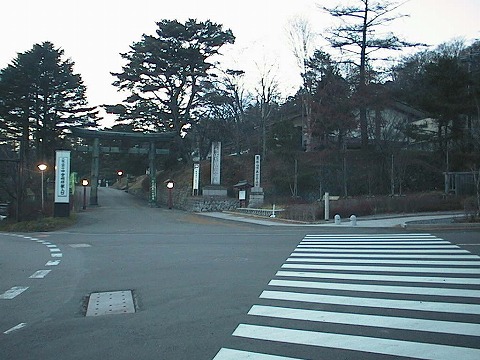 | いろは坂を過ぎた辺りの林道入口をバスの窓から見張ったが、確認できず。夕方に中宮を訪問しました。立派な神社です、もちろん門も本格的なもので乗り越えられるような粗末なものではありません。薄暮の中を探し回り、抜け道・踏み跡を見つけ、これで安心と宿舎へと引き上げ。 |