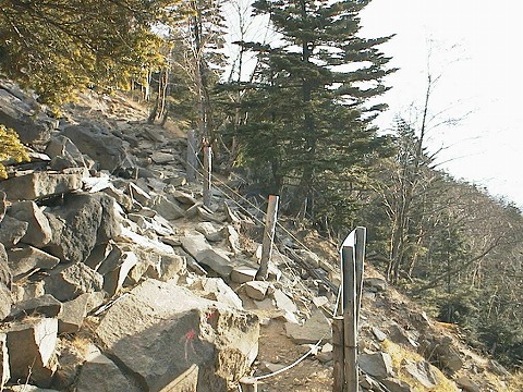 ところで、この砂礫帯は歩きにくいですね。一カ所、変な矢印に惑わされて、危うく身動きできなくなりそうになりました。泣きながら数mを這いずってトラバース、見ている人がいなくって良かった(^_^;)。