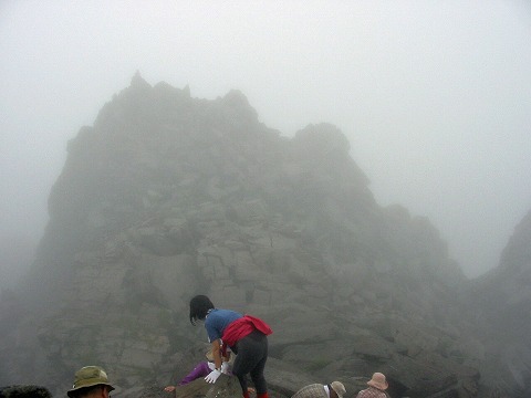少し下って雪渓を横断し、多少急な斜面を一時間ほど登ると大物忌神社に到着。雨具を着けるほどではなかったですが、周りの視界のない霧の中での急登は疲れます。一息入れ、空身で山頂の新山への岩場に取りつきました。手がかりと足がかりが十分にある、しっかりした岩場ですので、両手・両足を使ってのよじ登りを楽しめました。まるでホラー映画のように奇妙な形をした大きな突起、岩が霧の中に朧に浮かび上がってくるのもなかなかのものです。狭い山頂を交代で譲り合って記念撮影し、約1時間の岩場遊びも終了。神社に戻り、弁当昼食。風が強いのに霧の晴れる気配もなく、霧雨状態で外輪山巡回は中止となってしまいました。