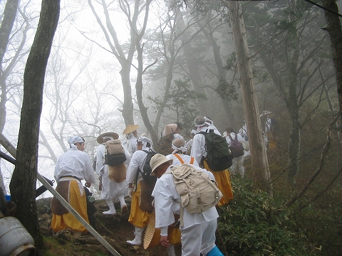 ゴールデンウイークにしては人も少なく、がら空きのロープウェイで山頂駅まで10分弱、ここから20分ほど参道を登ると成就社です。境内のすぐ近くに旅館が3軒ありますが、我々は白石旅館(数年前に泊まった山頂小屋の系列)に予約しています。流石に信仰の山らしく、行者さんの集団、普通の登山姿だが信仰登山らしい方達が目立ちます。