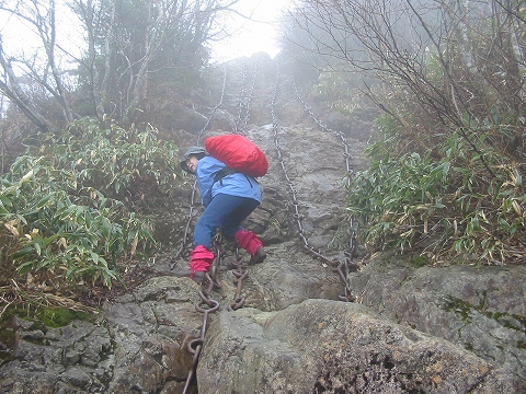 鎖場はすべて敬遠して巻道を通り、出発から約2時間半で山頂に到着。途中で雨がついに降り出し、山頂は強い風とガスで視界が数mほど。なんと、山頂小屋は工事中でした。防空壕のような狭い避難小屋があり休憩。以前にあった白石旅館の小屋は取り壊され、神社直営の立派な宿坊ができるようです。