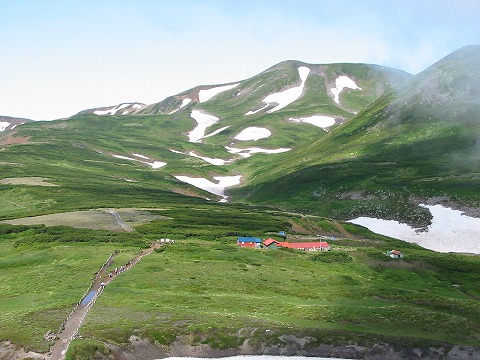 ま、それはともかく、強い風に追い立てられて、次の旭岳を目指しました。鞍部のキャンプ場を過ぎた急登の雪渓はアイゼン不要でした。 身体が揺らぐような強い風にあおられながら、やっと旭岳ロープウェーに到着。下駅に待っていたチャーターバスに乗り、約1時間半で十勝岳温泉のカミホロ荘(民営の国民宿舎)へ。ヘルスセンターみたいな宿舎でした。土色の温泉は水量が少な目でしたが、疲れを癒すのになかなか快適。