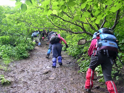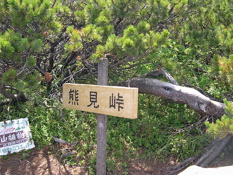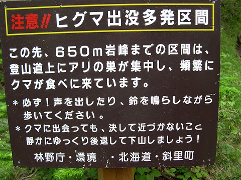 | 岩峰にヒグマが出るので注意の看板、好物のアリを食べにくるらしい。ダケカンバ林の平坦な極楽平を経て、大沢に到着。ここから始まる雪渓、帰りの下りはやはり厳しかった。ネット情報では数日前に滑落し大岩で大怪我とか、私達はアイゼン持って行ったが、ツアリーダーの判断で使用せず(持ってない人が多かったためか?)、相当に恐い思いをしました。実際にツアのひとりがかなりな距離を滑落。幸い、大岩の手前で停止したが、なんとツアリーダーは放置。許せない。ここのツアは使うべきでない。 |