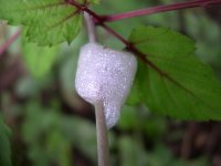 小仏側から景信山へ。途中の登り道にヤマイチゴ、ヤマテリハノイバラ、草についた白い泡などを見つけ、ワイワイ言いながら写真撮影。景信山の頂上では凍らせて持ってきたビールで乾杯。