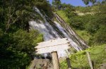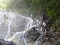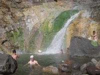 | ツア客18人とリーダー・サブ2人。チャーターしたマイクロバスで小清水原生花園、知床峠(ガスで展望は皆無)を経て、温泉の流れる沢−カムイワッカの滝へ。地元の親父さんが500円でワラジを貸していたが、山用の靴下で歩く。硫黄の強い泉質です。本日の宿、その名も「ホテル地の涯」に行く前に知床5湖を観光、ヒグマ出没で入れるのは2湖まででした。道路脇のヒグマを車窓から観察(^_^)。 | カムイワッカの滝 |