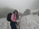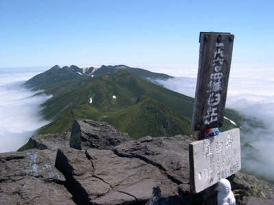| 3時起床で弁当朝食を食べて出発。流石にここまで早いのは初めてです。登り約1時間でオホーツク展望台、二人くらいが腰を下ろすといっぱいの感じの岩です。630岩峰にヒグマが出るので注意の看板がありましたが、好物のアリを食べにくるらしい。ダケカンバ林の平坦な極楽平を経て、大沢に到着。ここから雪渓が始まります。 けっこうな大きな雪渓で、上の半分は急斜面。下りは苦労しそうです。ここでガスが突然に晴てきて、目の前に花畑が拡がりました。だ。出発から4時間で広々とした羅臼平に到着。正面に羅臼岳山頂の小高くなった峰、反対側には三ツ峰から硫黄山を眺めながらの食事。ここはテン場にもなっていてヒグマ避けようの食料庫も用意されてます。カナディアンで見たロープ吊り方式ではなく、金属容器の方式です。ここから山頂まで約1時間、直下の岩場は急登で両手・両足を使って登る感じです。朝方のガスも晴れて素晴らしい青空で、知床連山そして雲海に顔を出している国後島のチャチャ岳の展望が素晴らしかったです。 |