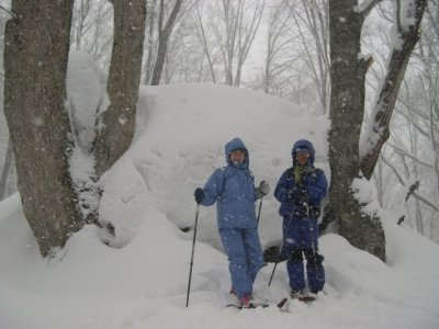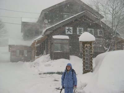 かなり雪が降ってきましたが、雪を求めて来た我々は重ね着にゴアテックスの雨具、スパッツに登山靴の出で立ちで辺りの散歩に飛び出しました。目の前のスキー場も風と雪で閉鎖されているようだし、歩いている人は殆どいません。少し先に、雪の道路を挟んで施設が点在してるホテルがありました。雪に埋もれた道標があって、「あっちは露天風呂、こっちはスナック」などと案内してあります。荒天だとホテルの中で遭難しそう。