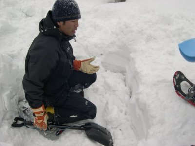 乳頭温泉の休暇村周辺を案内してもらいました。短い時間でしたが、ふわふわの雪の上にトレースをつけながらのスノートレッキング、初めてのスノーシュー体験とあわせて楽しく遊ばせてもらいました。