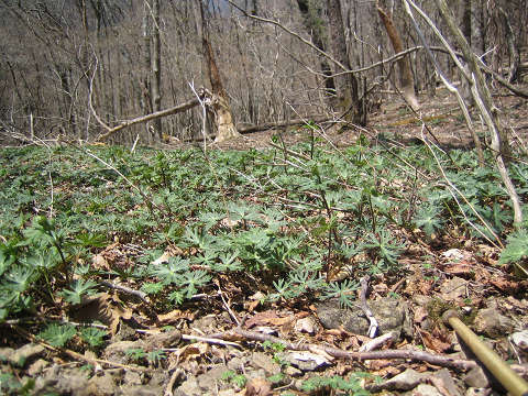 | やっと登山口に到着、なんと車が一台落下して放置されていました。大山ヤビツ峠の林道でも10年近くも木に引っ掛かった車が放置されていましたけど(^_^;)。先客の広島ナンバーの車の横で身支度していると神戸から来られたという二人連れの方が反対側から歩いてこられました。道の崩壊で車が入れずえんえん歩いてこられたそうです。登山道の途中には期待したカタクリの花はなかったですが、トリカブトとハシリドコロが群生・・うーんですね。これでもかというほど赤テープがあり、踏み跡も明瞭ですが、尾根に出る手前きれいな苔むした庭園風景に引きずられて道をはずれてしまいました(^_^;)。 | |||||||||||
