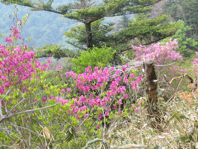 | 原生林を過ぎて、視界が開けてきました。まずはピンクと朱のツツジの花のお出迎えです。 |