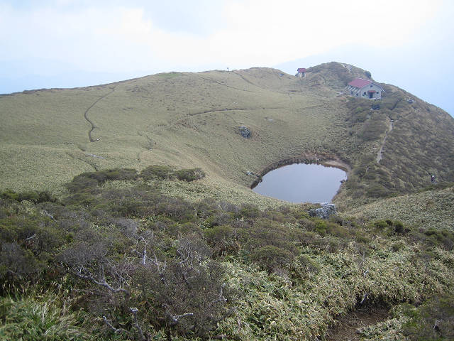 | 山頂付近の池と避難小屋そしてたおやかな草尾根の拡がる山頂部 |