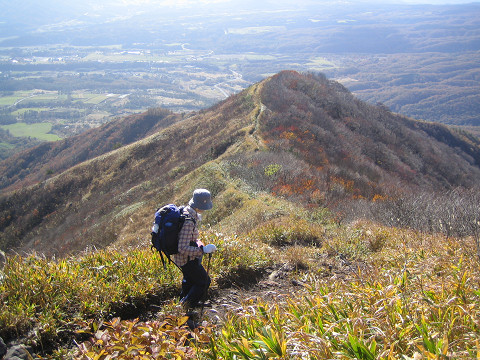 | 陽のあたり具合がもうひとつですが、山頂まで快適な広〜い尾根を登っていく途中の紅葉です。 |