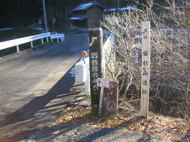 今年の夏は異常な渇水だった那賀川ですが、ここら辺りは伏流水になっているのでしょうか。今も表に見える水量は少ないです。すぐに遍路道への分岐。ウラジロのジャングル?を過ぎると・・・・・若杉山遺跡の標識が出てきます。 |