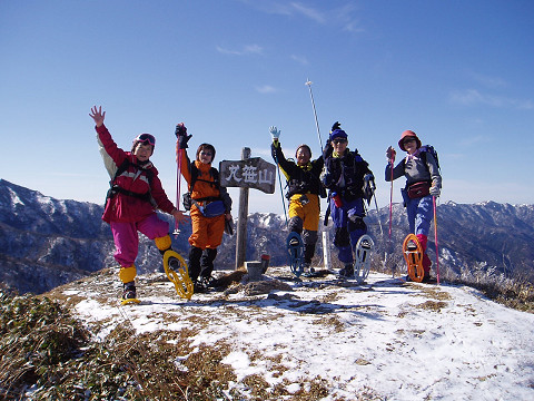 | 20〜30分ほど歩行練習と足慣らしの後、メンバー勢揃いしてガイドさんに写真を撮してもらてから、さあ出発。夏道の登山口の標識もクリヤです。確か、年末の写真では、ほとんど埋もれていたような。雪はだいぶ減ったようですが、まだまだスノーシューで快適に歩けます。 |