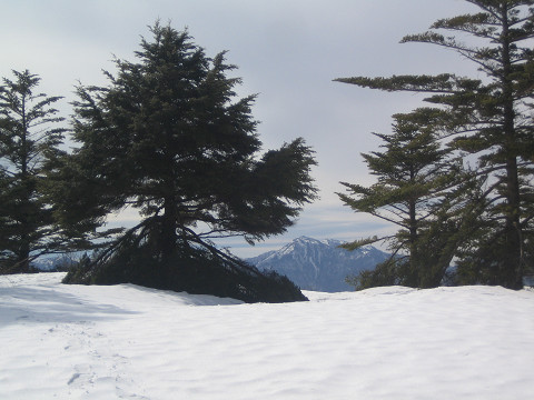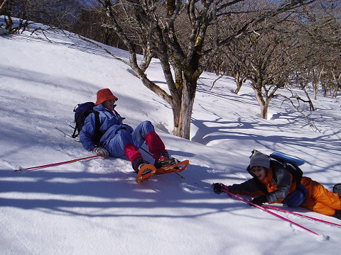 | 昼食後は雪原の散歩です。もう雪も締まっていてスノーシューをはずしての散歩。夏は藪で歩けないそうです。あちらこちらで木の大きな枝が積雪のために折れていました。南国のイメージの強い徳島ですが、ここでも自然の厳しさを感じます。 |