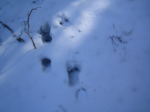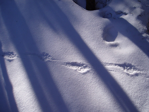 鹿、ウサギ、きつね等の足跡ですね。なんでもキツネはまっすぐの足跡、狸はあっち行ったり、こっち行ったりらしいです。 |