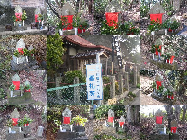 国土地理院の地形図では芝山と記載され、地元では日の峰と呼ばれているこの山域は、徳島市と小松島市の境にあって、江戸時代は蜂須賀藩の保養地?として保護されていた景勝の地です。小松島市へ行く尾根道にミニ四国八十八ヶ所があり、小さな石の仏像群が祀られています。下に降りきったところに一番札所のお堂がありました。どうも個人の方が開基されたみたい。 |