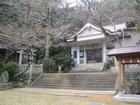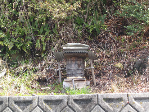 天神社の脇から石段の登山道を登ると神武天皇像前広場へ行く道とクロス、その後は山道の直登となります。途中にあった、猿田彦・大山祇神を祀った祠、その横には戦前にあったと思われる遙拝所の跡と書かれた石碑がありました。 |