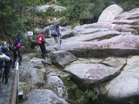| 沢の前後にネイチャーガイドさん、ツアリーダーさんが立って、沢にはザイル。すぐ下が滝のようになってましたが、ザイルとカラビナで繋いだシュリンゲを身体にかけてくれています。安心して渡渉できました。 |