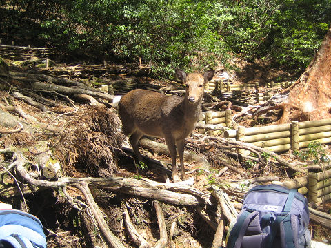 やっと林道、花山歩道入口に到着。ここでバスに拾ってもらいました。屋久島猿にも出迎えてもらいました。