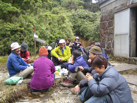雨もやっと小振りになり花山広場でお茶休憩。ここら辺りからヒルが多いそうです・・・が、気温が低めで、水の流れもあって、集団ではお出ましにならないようです。 |