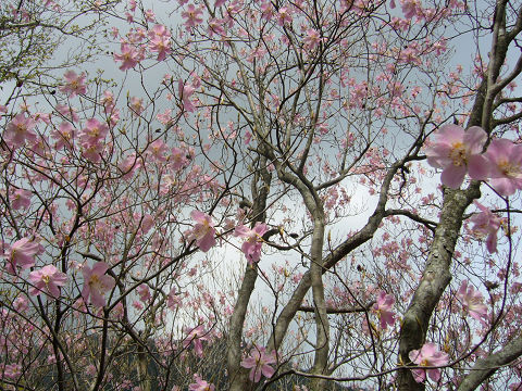 | 黒滝山の手前の斜面にアケボノツツジが7分咲き?。霧で霞むなか、斜面の少し下の方にピンクのアケボノツツジの陰に形は同じで白い色の花をつけた木が・・・前の日にカルスト学習館の方に聞いた「白いアケボノツツジ」かもわかりません。帰りに学習館に寄って話をしたところ、もしそうなら新発見だとの事。 |