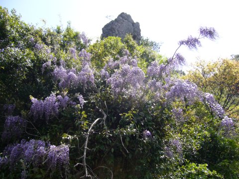 やっとたどりついた石門公園の岩そして藤の花です。岩が両側に立っていて門のようだという事で石門。ガイドブックによれば、ロッククライミングも楽しめるとか。