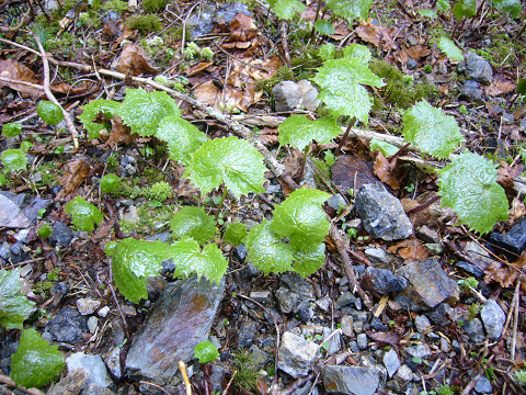 この横道が花畑になっていて、キレンゲショウマの群生地です。まだまだ、やっと地面に顔を出したところです。今年は他の花も遅いようで、期待したヤマシャクヤクは蕾の状態でした。 |