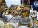 | 大阪から到着された友人ご夫妻に私達の山用の車に乗り換えてもらって出発。軽のジムニーです。一応、冬タイヤには履き替えていますが、車内はちと狭かったと思います。山にアクセスする狭い道の走行に馴れていないため、小さな車で我慢していただきました。ともあれ、まずは徳島市内から南下して日和佐に到着。お遍路さん、観光客に人気のランチバイキングのお店{橋本」で昼食。840円で麦飯+味噌汁に種類がいっぱいの副食、人気あるはずです。 |