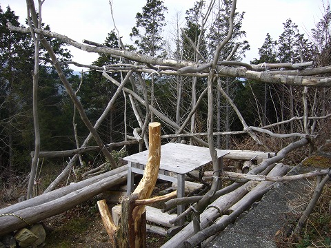 山頂ですが、今年の3月に屋久島縦走のトレーニングに来たときと変化してました。前の手作りベンチからバージョンアップして、丸太を使った小屋がけ?、天幕はれば簡易小屋になりそうです。沢山の薪、薪を燃やす竈もあります。我々二人だけで食事していると、10人くらいの方が来られました。設備を設置され、「いやしの道」も作られた方とそのお仲間だそうです。 |