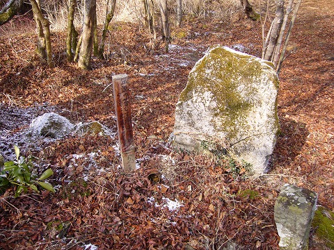 石地蔵尊の前を通過する整備された山道は下の林道に下りてしまうようです。アレレと途中で気づいて引き返しました。地蔵尊の後ろ側の道が縦走路。少し先でかなりな急斜面になります。積雪はほとんど無い状態ですが、凍結していて怖いです。帰りの下りはアイゼンを装着しました。 |