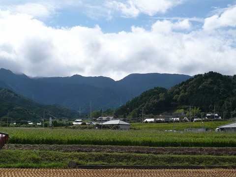 | 九州の西海上を通過中の台風11号の影響で天候が不安定。出発時には青空が一瞬見えたと思ったら、激しい雨と目まぐるしく変化。徳島を走行中に虹も見えました。更に西に進み美馬市の辺りでは山と平野の境界に霧が流れて、なかなかの雰囲気です。徳島道、愛媛道と通過してICを下りたコンビニから見た皿ヶ嶺です。 |