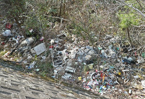 この県道は、とんでもないゴミロード。谷側に沿ってえんえんと不法投棄のゴミの山が続きます。