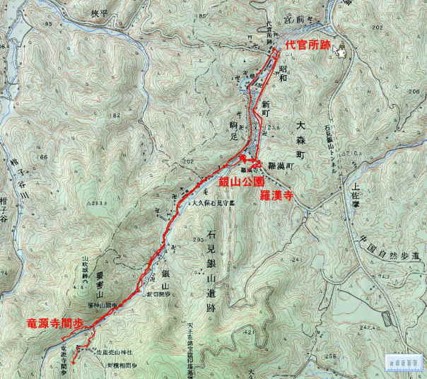 竜源寺間歩へ行く途中の里道にはお寺もあり、戦国時代の山城跡へ登る道、採掘された銀を港へ運ぶ道などもありそうだが、整備はまだのよう。ツアバスを降りた銀山公園の下、代官所跡までは昔の家並みを復元しようとしているようですが、これもまだ未整備だし、スケールも小さそう。