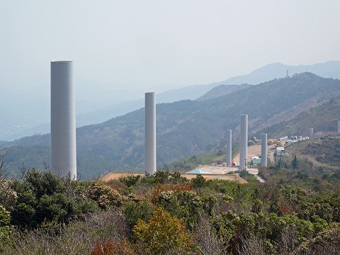 大川原高原の風力発電所の工事もだいぶ進んでいるようです。15機の下の柱はもう完成、4月末から風車部分を乗せる工事にはいるそうです。約3倍の高さになるそうです、なかなかの大工事ですね。