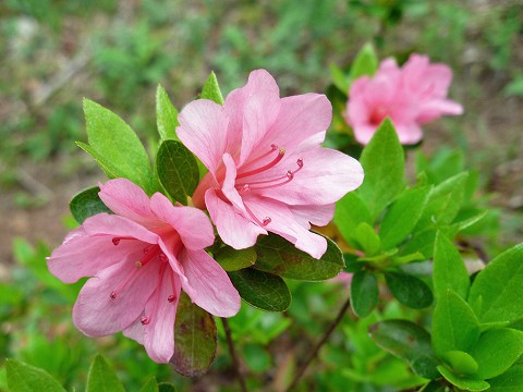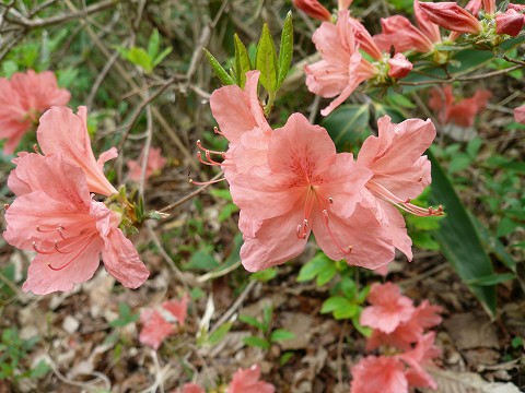 | 山腹を巻く横道の遊歩道を帰りましたが、両側にはたぶん植えたと思われるいろんな種類のツツジが花をつけていました。 |